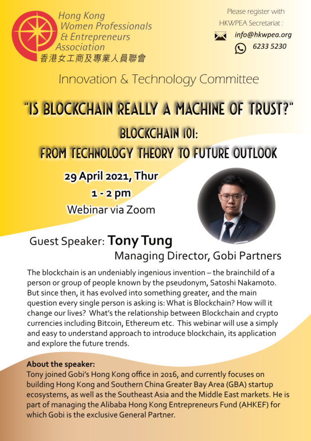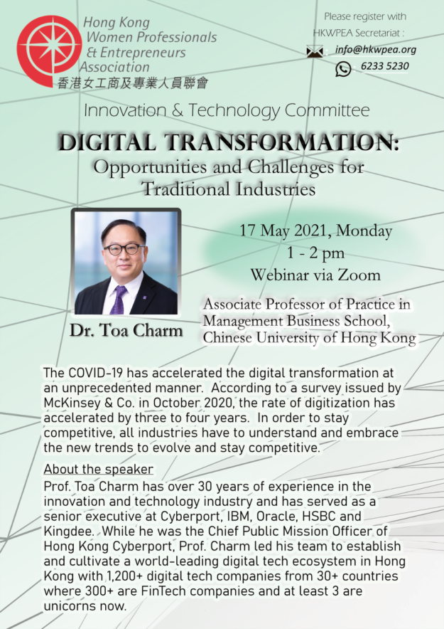 Date: 17 May 2021 Guest Speaker: Toa Charm, Associate Professor of Practice in Management, Business School, Chinese University of Hong Kong Committee: Innovation & Technology The COVID-19 has accelerated the digital transformation at an unprecedented manner. In order to stay competitive under rapid growth of digitalization, all industries have to understand and embrace the new trends to…
