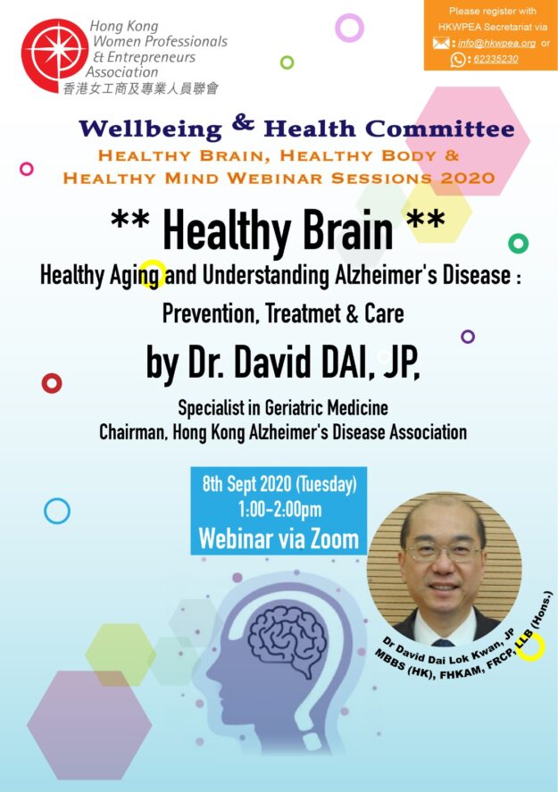 Date: 8 September 2020Guest Speaker: Dr David Dai, JP, Specialist in Geriatric Medicine Chairman, HK Alzheimer’s Disease Association