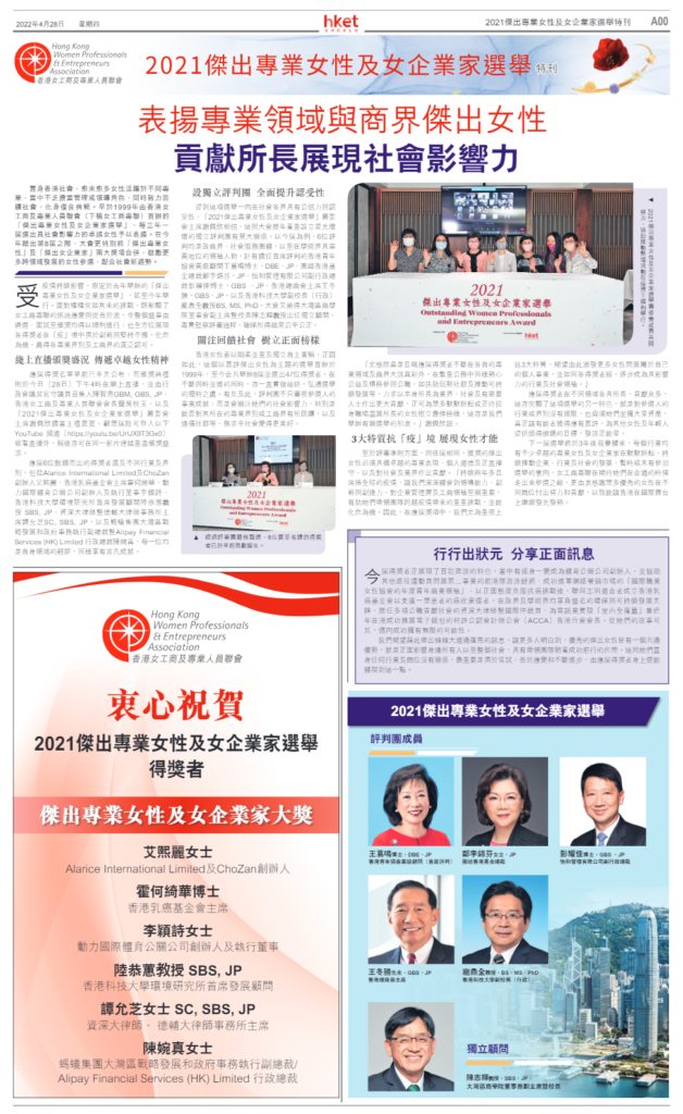 The Hong Kong Women Professionals and Entrepreneurs Association (HKWPEA) is proud to organize the 8th Outstanding Women Professionals and Entrepreneurs Award in 2021.  This Award was first organized in 1999 and is generally a triennial event.