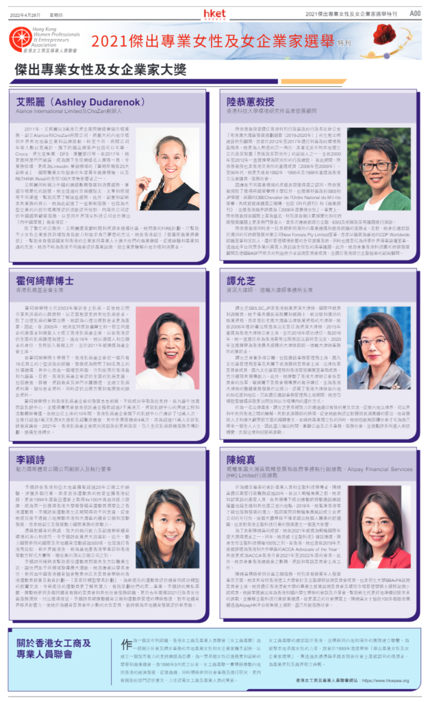 The Outstanding Women Professionals and Entrepreneurs Award honors and celebrates the achievements of women in Hong Kong.  It recognizes women professionals and entrepreneurs who have made significant contributions in their work and to society.  These are women who exemplify high integrity and ethical standards, providing outstanding role models to the community locally and/or globally.